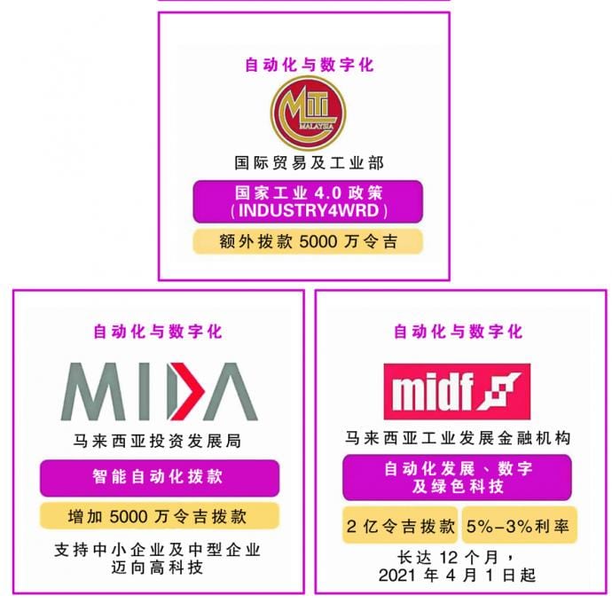 大马工业发展金融机构(MIDF)亦提供2亿令吉作为自动化发展、数字及绿色科技,并从4月1日起,将贷款利率从5%降至3%,为期12个月。而大马工业发展金融机构则拨款2亿令吉,推行多项自动化与数字化的低息融资计划,并提议将利息降至3%至3.5%,当前利率为4%至5%。