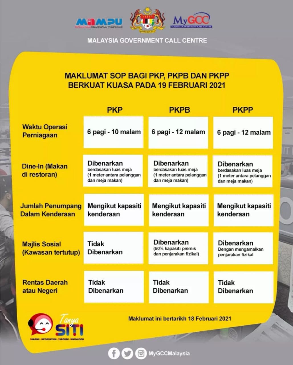 *行动管制令(MCO/PKP)* : 雪兰莪、吉隆坡、柔佛及槟城的将延长14天,从2月19 至3月4日。