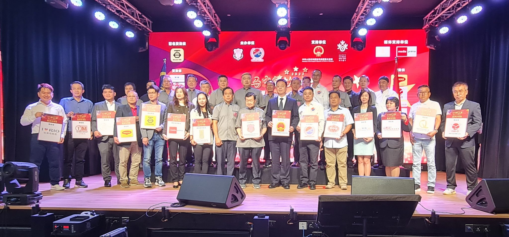 主办单位顺利为2022《马中餐饮大奖》盛会进行推介礼后和嘉宾及赞助商合影。前排左五起为苏文华、李緧颐、葛维镁、张锦辉、林德来、张振及高浩云。(李成友摄)
