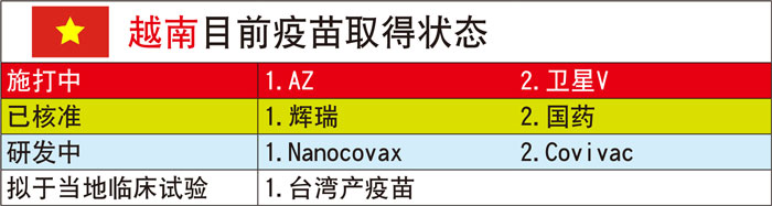 越南有4款国产疫苗研发中,其中包括由越南Nanogen制药生物技术公司研发的Nanocovax,该疫苗采重组蛋白技术,目前已进入第三期试验,最近申请紧急使用,但越南卫生部以科学证据不足、样本数太少为由拒绝。第二款是越南卫生部的疫苗与医用生物制品研究院(IVAC),所研发的Covivac(非复制型病毒载体疫苗),其余2款疫苗未有更多资讯,因此目前Nanogen与Covivac被认为是较有潜力的疫苗。台湾国产的高端疫苗,与越南国家卫生暨流行病学研究所(NIHE)已签署合作备忘录,准备在当地合作执行高端疫苗临床试验。