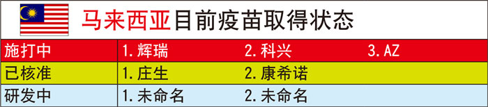 马来西亚已进行施打的疫苗包括科兴、AZ和辉瑞,已核准的包括庄生及中国康希诺疫苗,至于两款研发中的则未有更多资讯,仅知是分别采用mRNA和灭活技术的疫苗。马来西亚卫生部长阿汉峇峇6月12日称国家科学理事会,已于去年8月制定了研发疫苗的目标,以应对未来的疫情,预计2024年才有国产疫苗。
