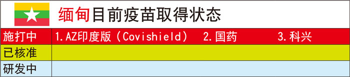 缅甸在今年2月1日发动军事政变后,医疗体系已濒临崩溃,每日筛检能量有限,因此无法有效确切统计实际的确诊人数。中国在5月2日给缅甸送来了50万剂的国药疫苗,而科兴疫苗也在中国红十字会的协助下,在边境地区施打。缅甸在今年1月也接受了印度援助的150万剂Covishield疫苗(印度版AZ),该疫苗是由印度血清研究所按照英国牛津大学与阿斯利康的技术生产的。