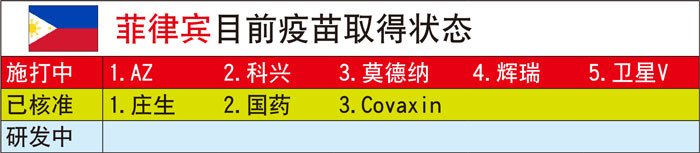 目前疫情严峻程度仅次于印尼的菲律宾,该国已进行施打、核准的疫苗,是东协国家中最多的,已施打的疫苗包括辉瑞、AZ、科兴、莫德纳和卫星V,已核准的包括庄生、国药,以及印度国产疫苗Covaxin。