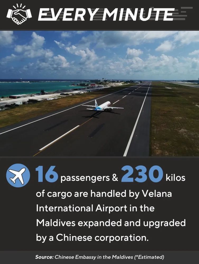4. 每一分钟:16名旅客和230千克的货物在由中国企业扩建升级的马尔代夫维拉纳国际机场得到安排和运送