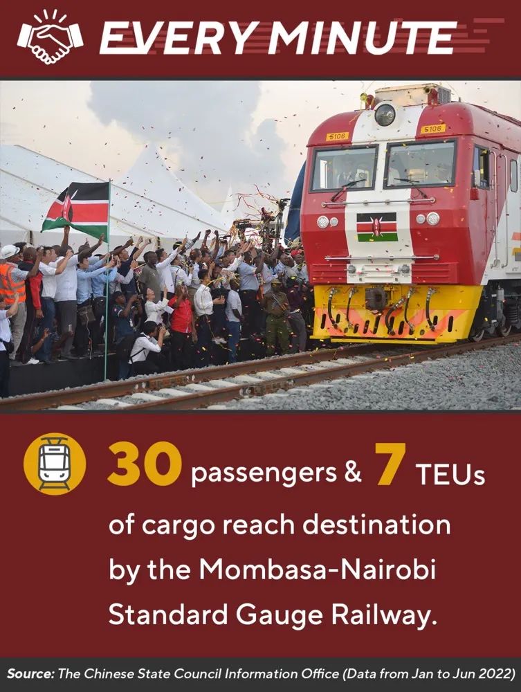 2. 每一分钟:30名旅客和7标箱货物通过蒙巴萨-内罗毕标轨铁路(蒙内铁路)到达目的地