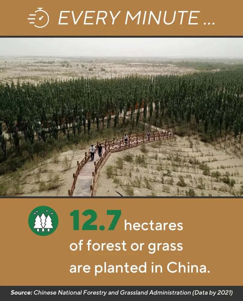 2. 每一分钟:中国添加12.7公顷的森林或草地面积