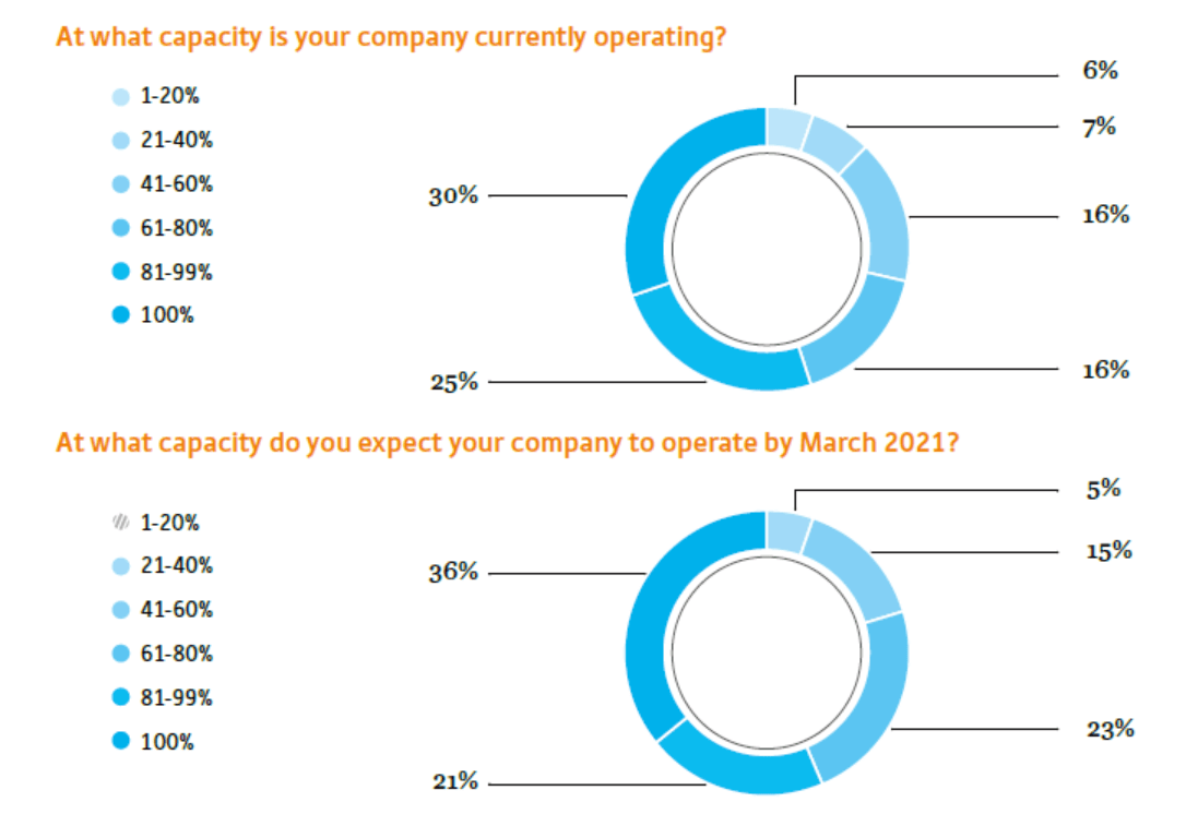 预计到了2021年的3月(意即本月),百分之五十七(57%)的企业已经营业超过该企业的整体操作能力的百分之八十 (> 80%)。