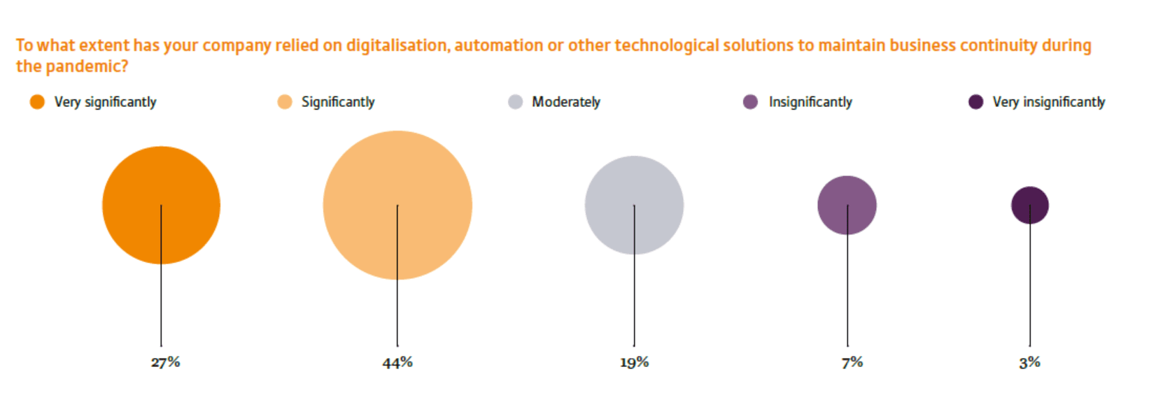 对全世界而言,新冠肺炎病毒流感大流行造成的经济影响最为正面的就是数字技术的提升。在埃及Covid-19 CEO调查中,有71%的受访者表示,他们非常或非常依赖数字化,自动化或其他技术解决方案,以在在危机期间各个企业能继续维持业务。