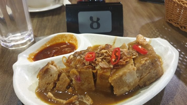 在昔加末,卖点是一碗清沏的“豆腐肉羹汤”。店家说,本来他们的肉骨茶,也就是潮式肉骨茶——色泽是淡、清清,可是昔加末以福建人为主。肉羹汤。别看只是青青白白的青葱与葱白穿夹在豆腐及肉羹里,清白也有好滋味的,看到浮上汤面的油印吗?
