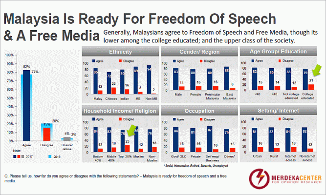 默迪卡民调中心的一项调查发现,约有73%大马人赞同保留煽动法令,以便维护和平和稳定。不过,调查也发现,大马人对自由价值似乎有矛盾的态度。